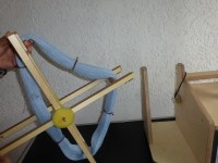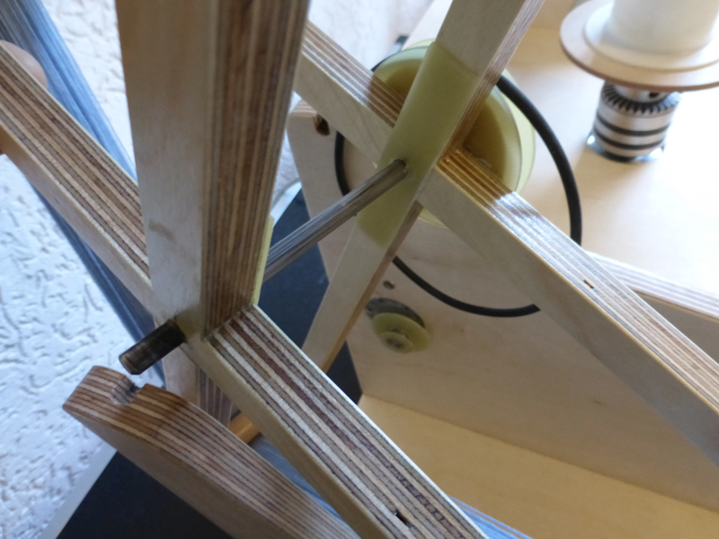Die gefachte Wolle auf die Spindel setzen und über die Ösen an der Rechteckleiste (oder alternativ über eine Deckenführung) zur Haspel führen und befestigen