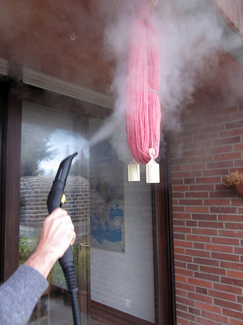 Auch behandelte ich die aufgehängten und mit Gewichten beschwerten Stränge mit Dampf aus dem Dampfreiniger. Ein leistungsfähiges Dampfbügeleisen käme auch in Frage. Auch das führte zu mehr oder weniger befriedigenden Ergebnissen, doch Zeit- und Arbeitsaufwand waren aus meiner Sicht immer noch zu hoch.