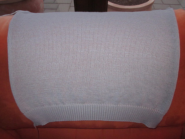 Dieses Foto zeigt ein Pulloverteil in glatt rechts gestrickt, so wie es von der Maschine abgenommen wurde. Die Wolle wurde nach meinem Verfahren drallberuhigt. Wie man sieht, ist das Strickstück ganz gerade und nicht verzogen und außerdem bereits ganz wunderbar weich.