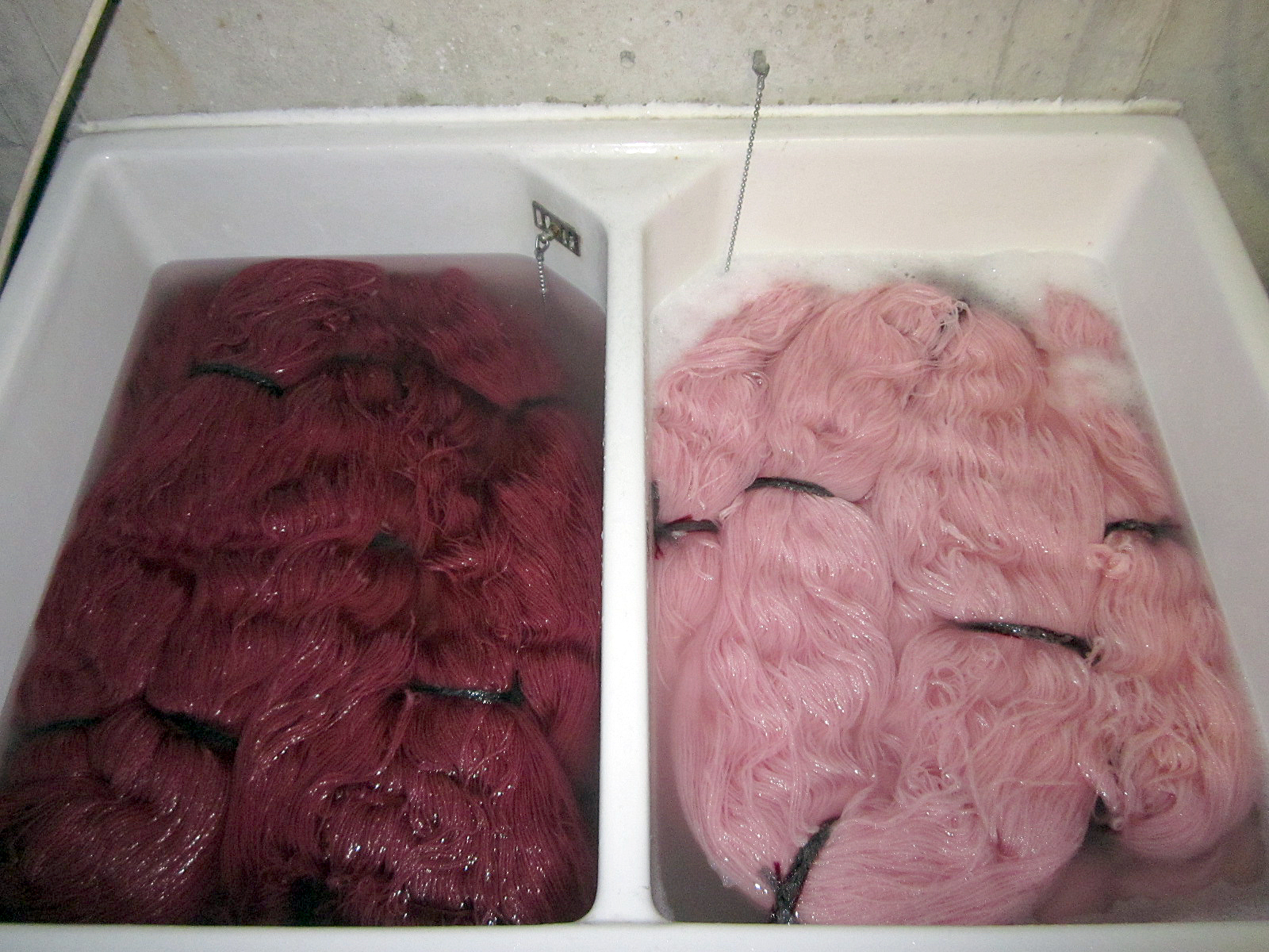 Die kompletten Stränge werden in kaltes oder heißes Wasser gelegt, evt. gleich mit Wollwaschmittel. Ich benutze meist heißes Wasser mit Wollwaschmittel, weil sich dadurch das lästige Waschen der Maschenprobe erübrigt. Je dicker die Stränge sind, umso länger sollten sie im Wasser verweilen, mindestens aber eine halbe Stunde.
