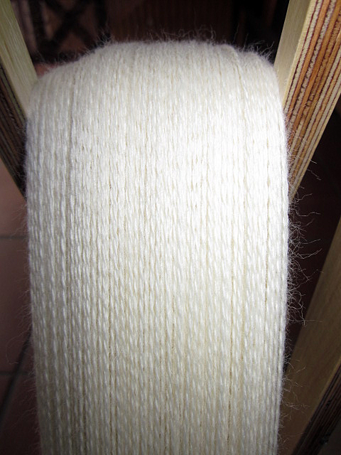 Ich binde die Wolle auf der Haspel vor dem Entnehmen an 4 Stellen locker ab.