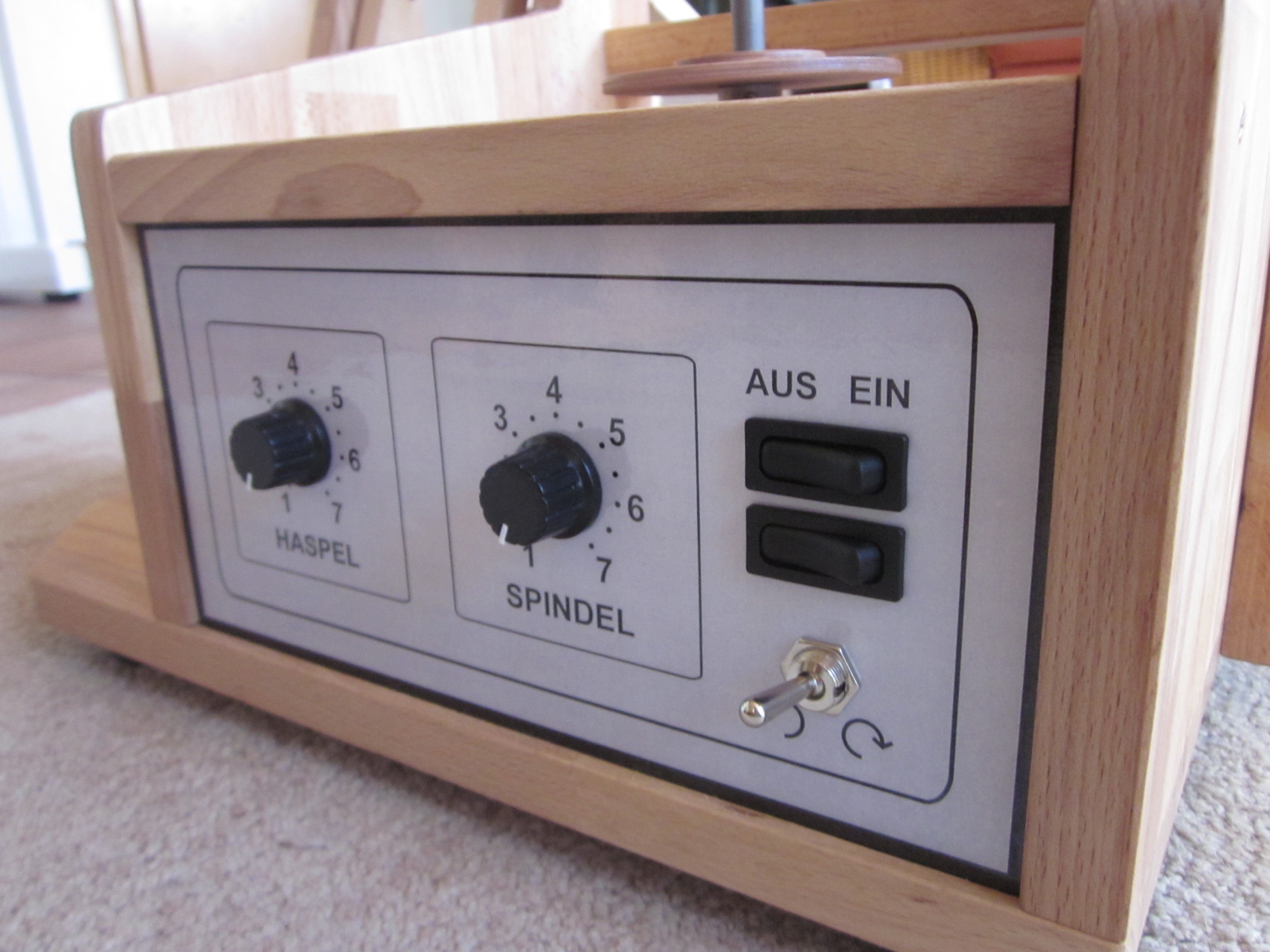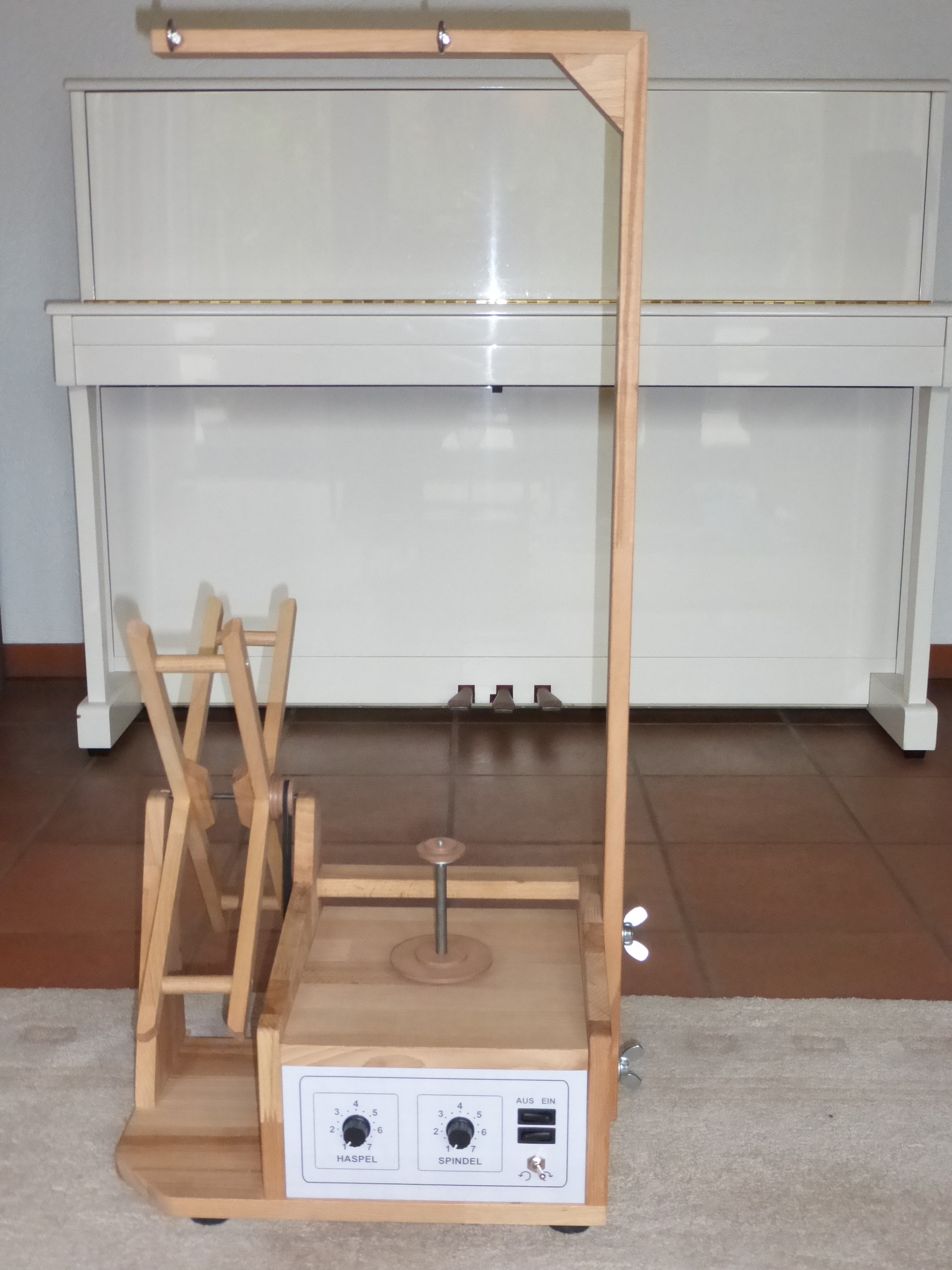 Ab sofort wird das Gehäuse des Wolltwisters sowie die Haspel aus massivem Buchenholz gebaut. Die Drehzahl der stufenlos regelbaren Spindel wurde auf 2600 Umdrehungen pro Minute erhöht und die Geschwindigkeit des Haspelmotors angepasst. Brother-Konen mit bis zu 300g Garn lassen sich mit höchster Einstellung noch sicher und problemlos verarbeiten. 250g 4-fädig gefachte Wolle für den Feinstricker werden in 30 Minuten mit 80 Windungen pro Meter vertwistet.