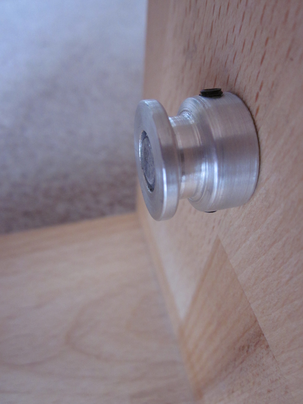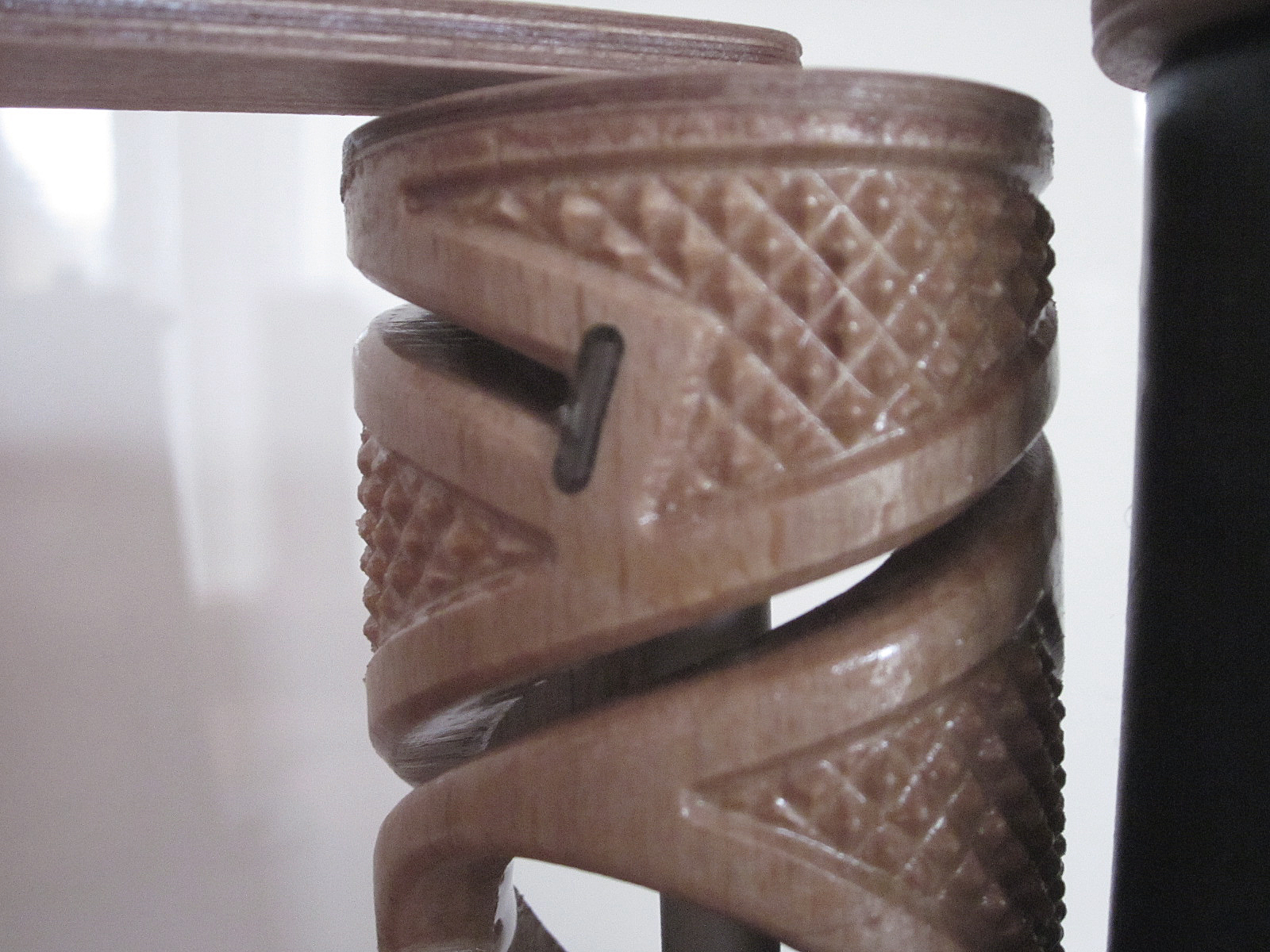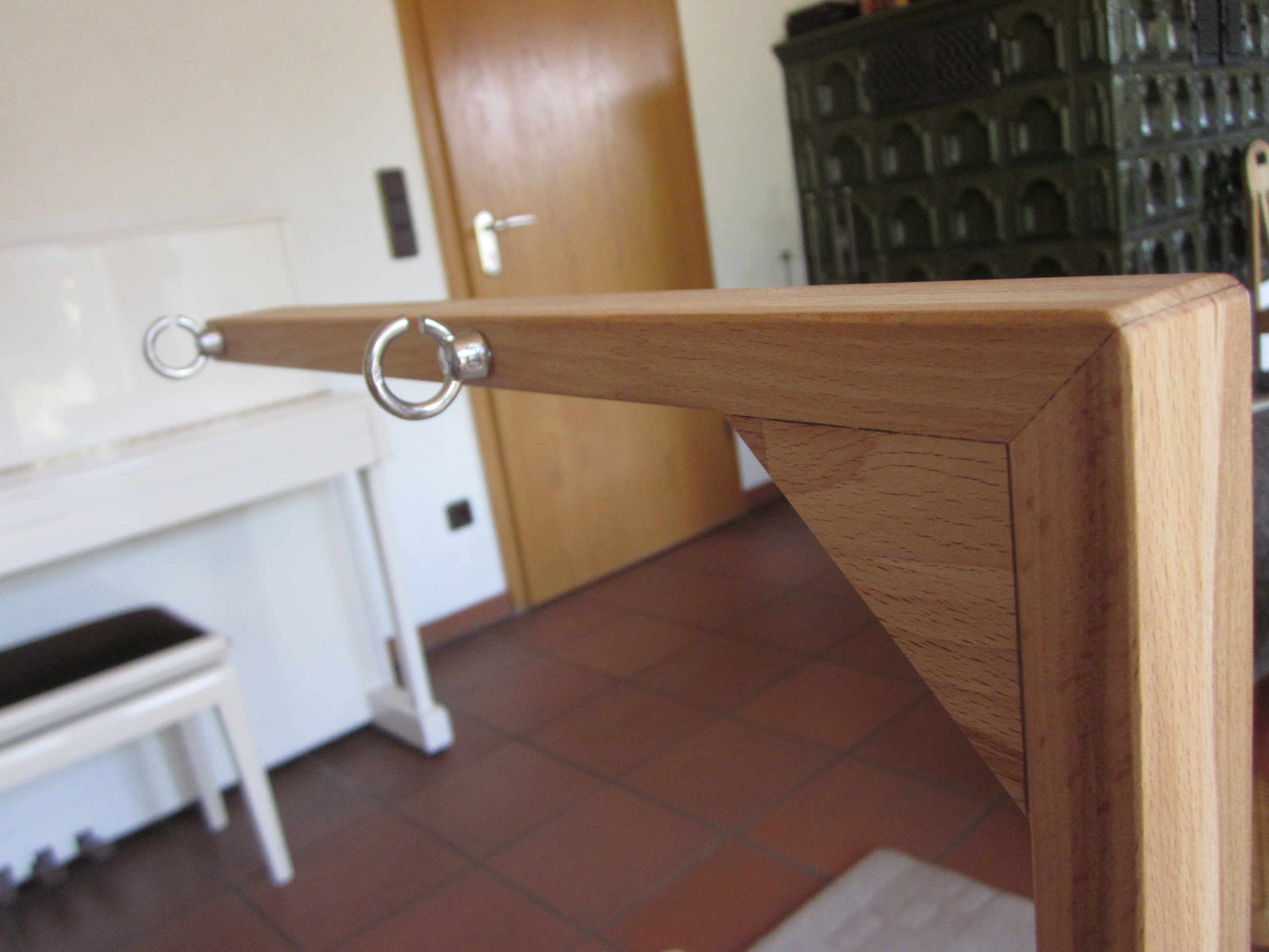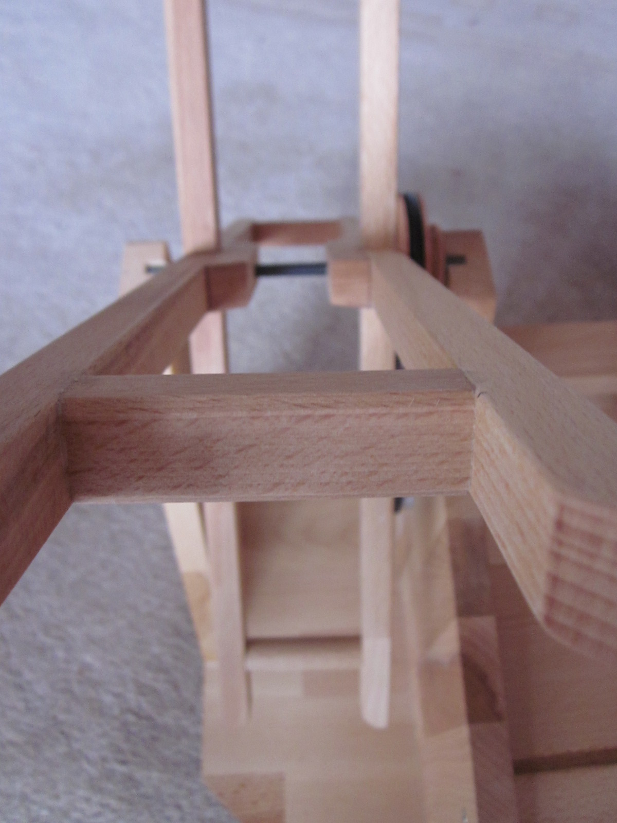 Der lösbare Steg der Haspel wird zwecks besserer Erkennbarkeit im Gegensatz zu den anderen Stegen aus einem Rundholz angefertigt. Da er durch die eingelassene Schraubhülse aus Metall ca. 20 g schwerer ist, wird im Steg auf der gegenüberliegenden Seite nun ein Gegengewicht eingebaut, wodurch der Rundlauf noch gleichmäßiger wird.