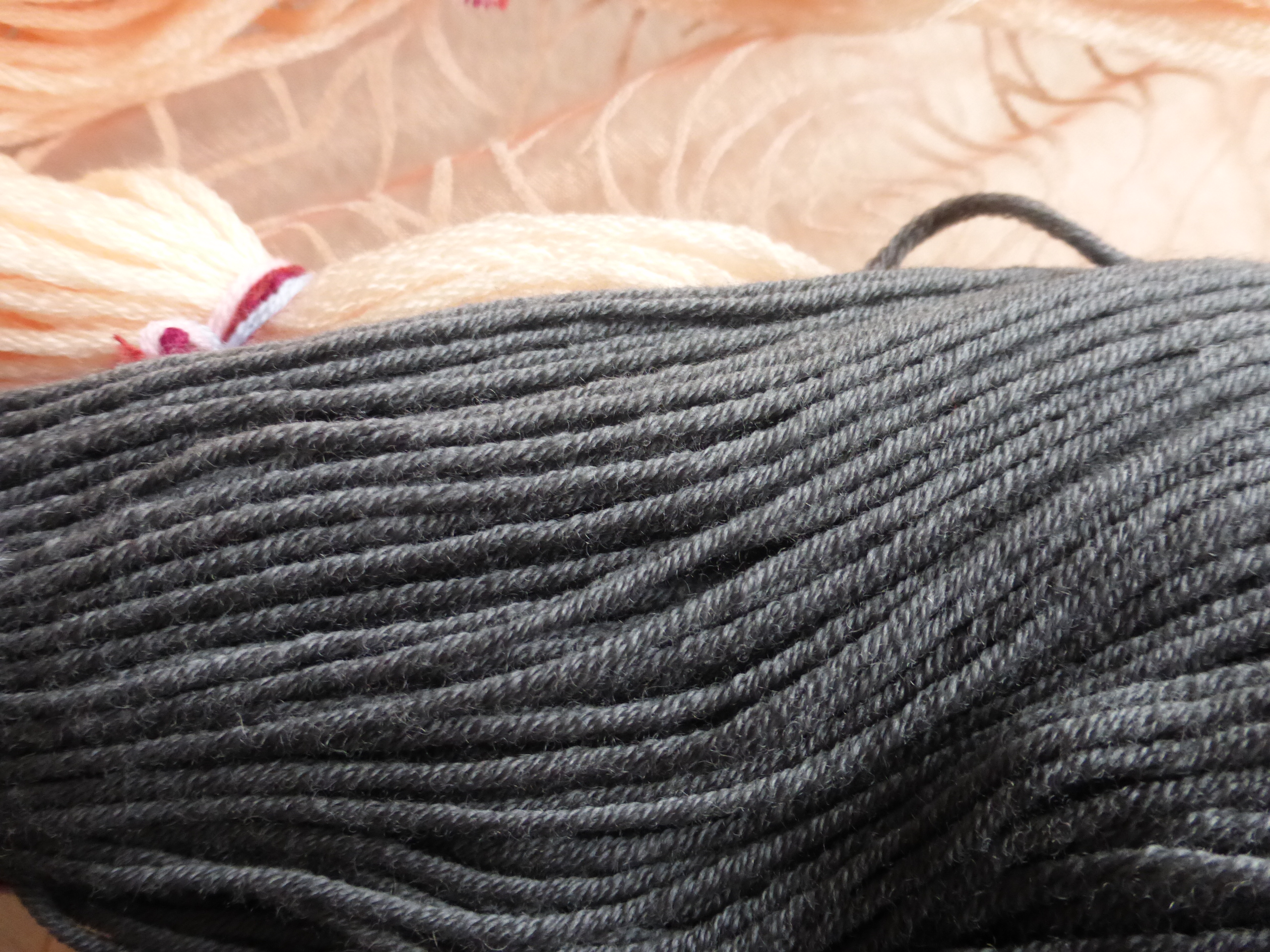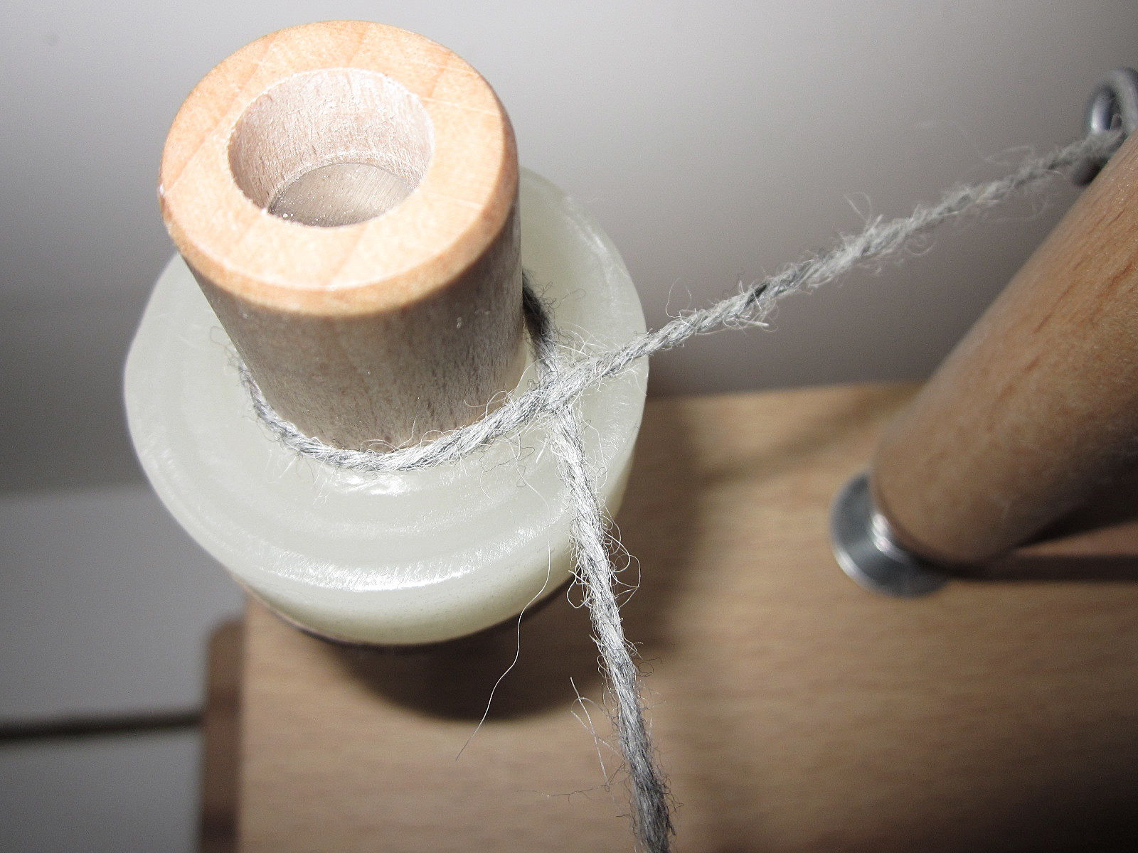 Schon auf den Fotos ist ersichtlich, dass die gleiche Wolle (25% Kaschmir mit 75% Merinowolle 8-fädig gefacht) einmal mit 60 und einmal mit 80 (die graue Wolle) Windungen pro Meter in einem Durchgang vertwistet, ganz andere Eigenschaften hat. So lässt sich je nach Verwendungszweck das passende Garn herstellen.