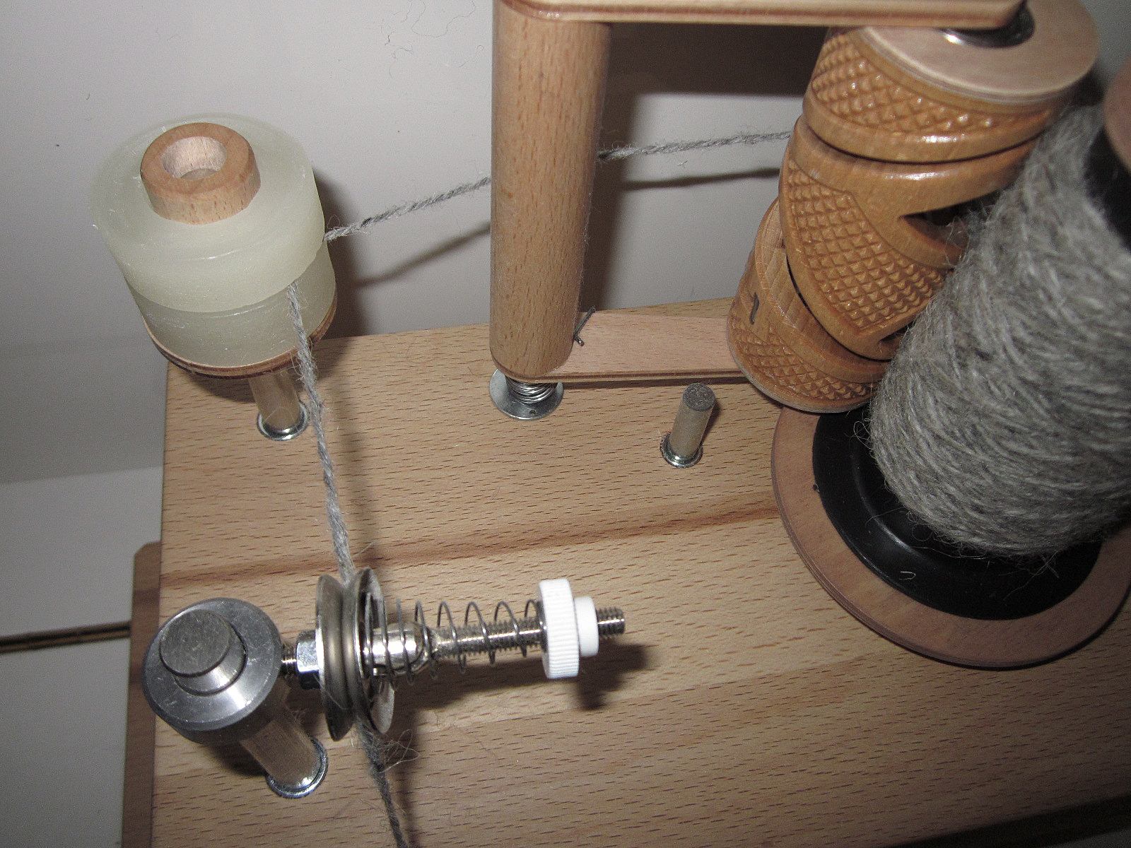 Der Anpressdruck der Kone auf den Teller und der Anpressdruck des Aluminiumkegels auf den gummierten Konenteller lassen sich separat einstellen. Dadurch ist sichergestellt, dass sich der Konenteller auf Dauer in einem konstanten und beliebig wählbaren Verhältnis zur Umdrehung der Hauptachse mitdreht. In der Grundeinstellung dreht sich der Konenteller bei einer Umdrehung der Hauptachse um eine 1/12 Umdrehung. Wird sie langsamer eingestellt (z.B. 1/16 oder 1/20) liegen die Fäden des Knäuels enger aneinander, bei schnellerer Einstellung gehen sie weiter auseinander. Natürlich gehen die Fäden bei dicker werdendem Knäuel auch weiter auseinander.